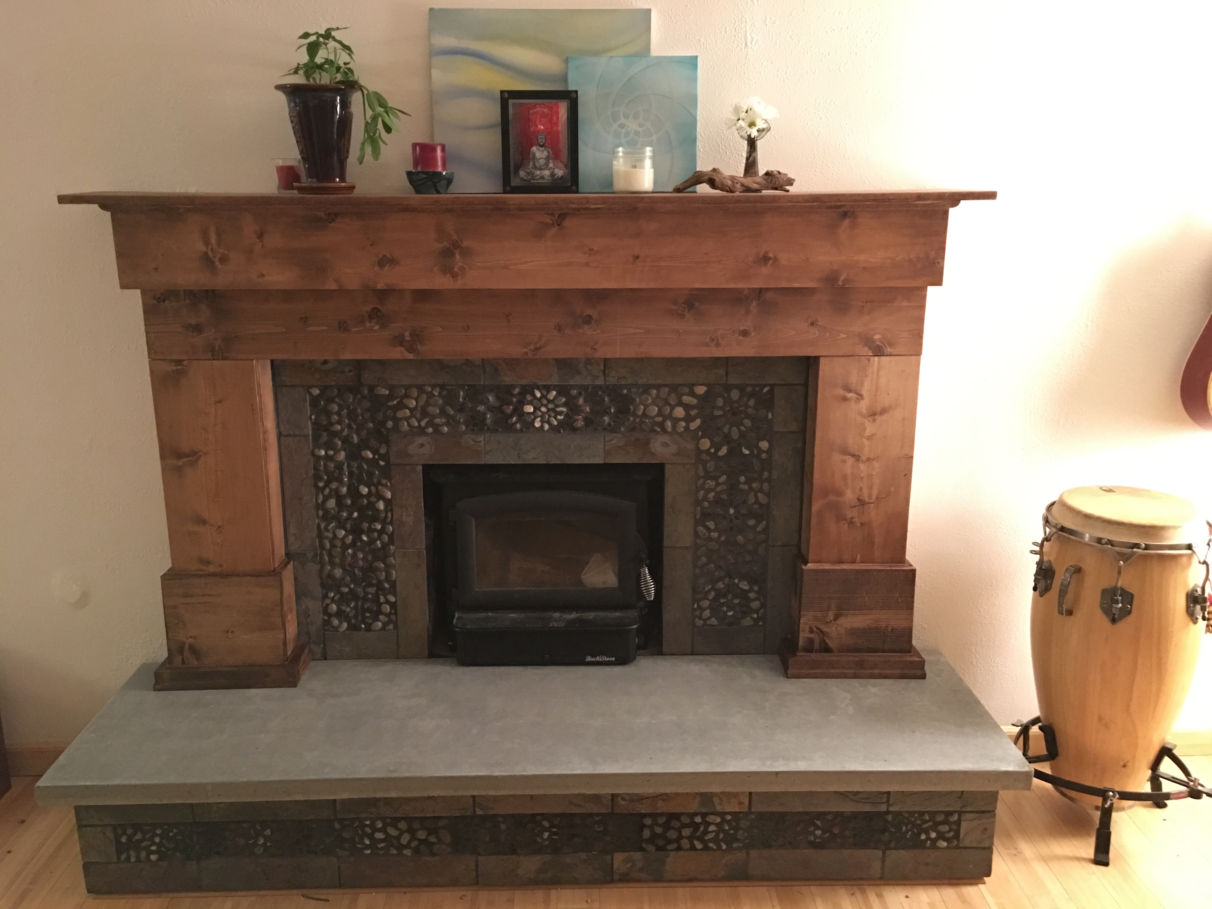Custom Stone Mosaic w/ Peacock Slate Tiles. Pine Wood Mantel, Surround and Aprons. Concrete Hearth.