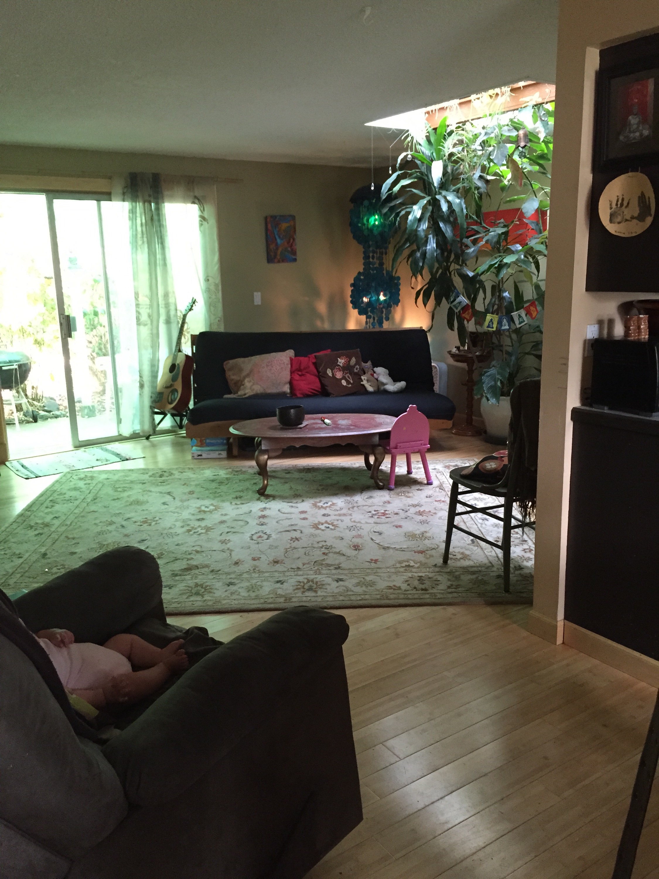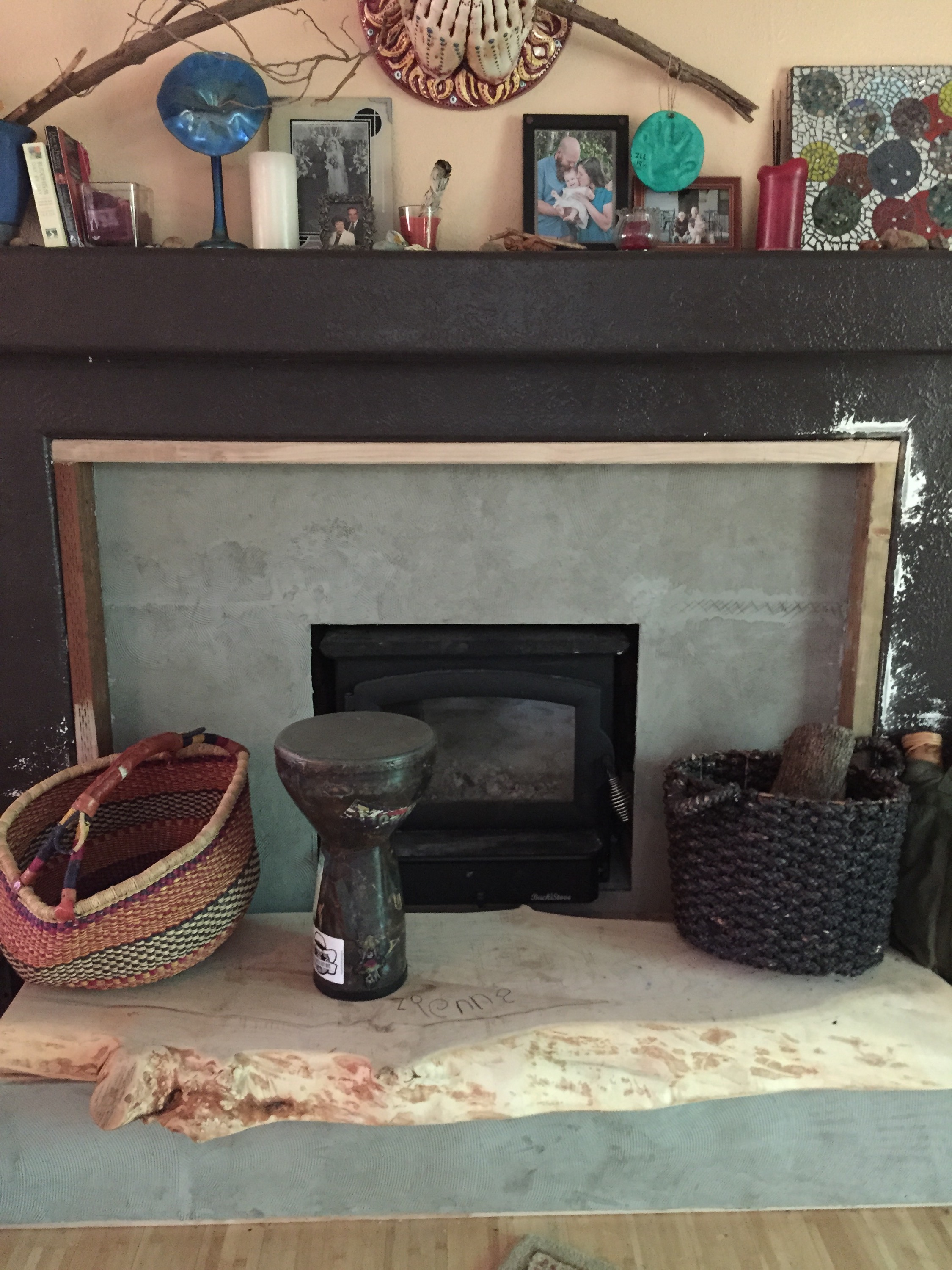 We like natural, biodegradable materials for furnature and flooring. Free sourced things are wonderful too! Thanks craigslist, buy nothing, and offer up for the hook ups! We replaced a non working gas fireplace with a wood burning insert. We added a gas range and smaller fridge for efficiency.